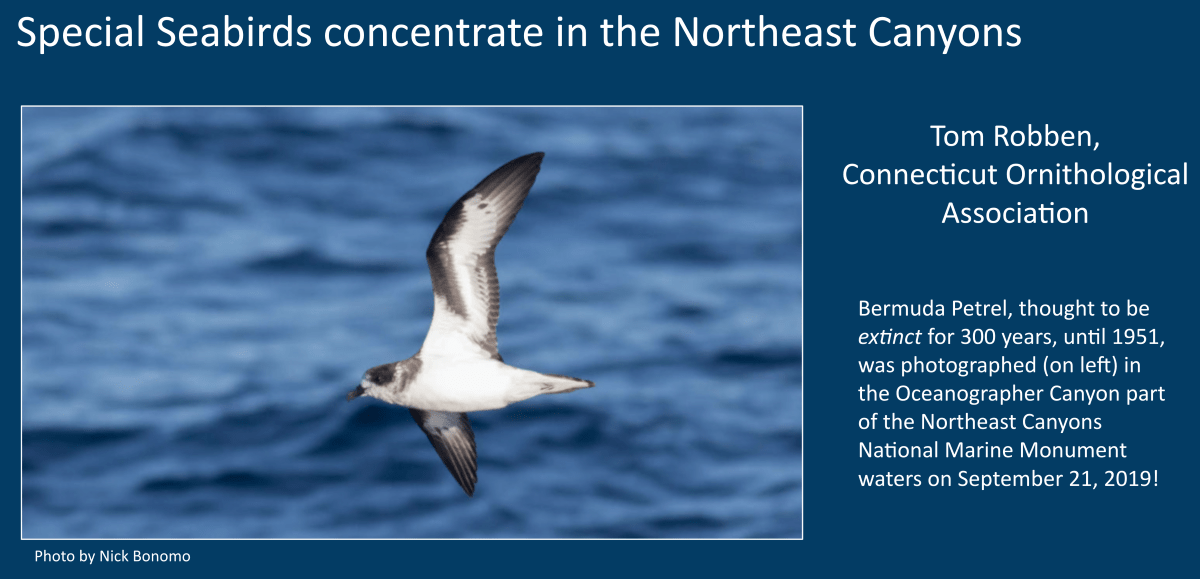 This slide (#24) featuring a rare Cahow that our own Nick Bonomo found in Northeast Canyons waters in 2019 was part of a live presentation on March 5, 2021 to the US Dept of Interior (Copy of NECSMNM DOI Listening Session – Google Slides). A DOI person told us later that this photograph supported their thinking about this issue and this body of water, that it was biologically special enough to attract rare birds like this Bermuda Petrel.